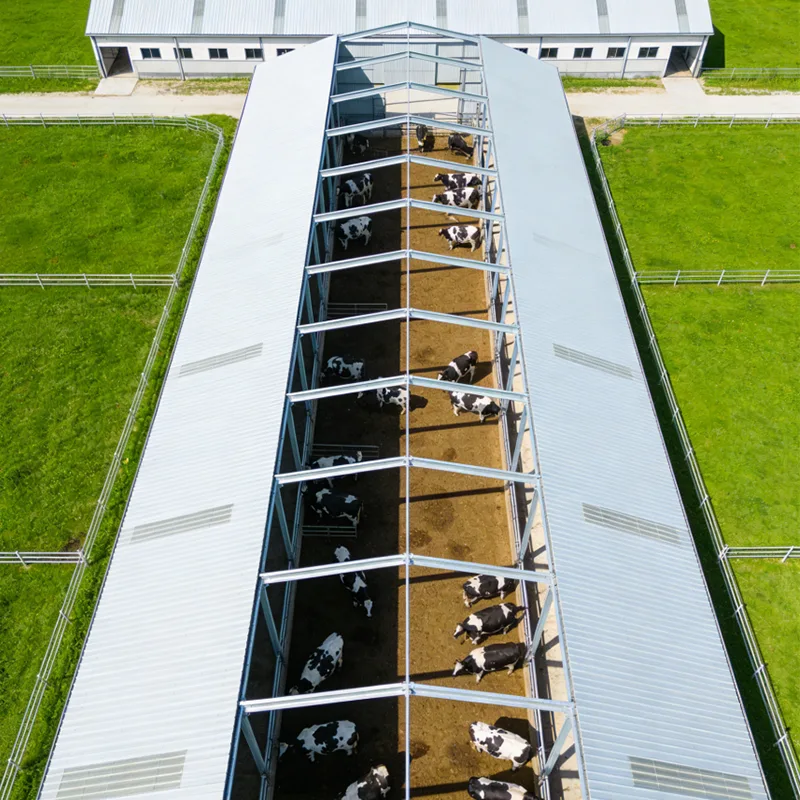 Nuestro cobertizo para ganado y granja lechera con estructura de acero es un edificio de cría profesional, duradero y rentable, especialmente diseñado para la ganadería y la producción lechera modernas. Con una estructura de acero estable, buena ventilación, excelente aislamiento térmico y características de fácil limpieza, proporciona un ambiente seguro, cómodo y saludable para el ganado vacuno, las vacas lecheras y otros animales.